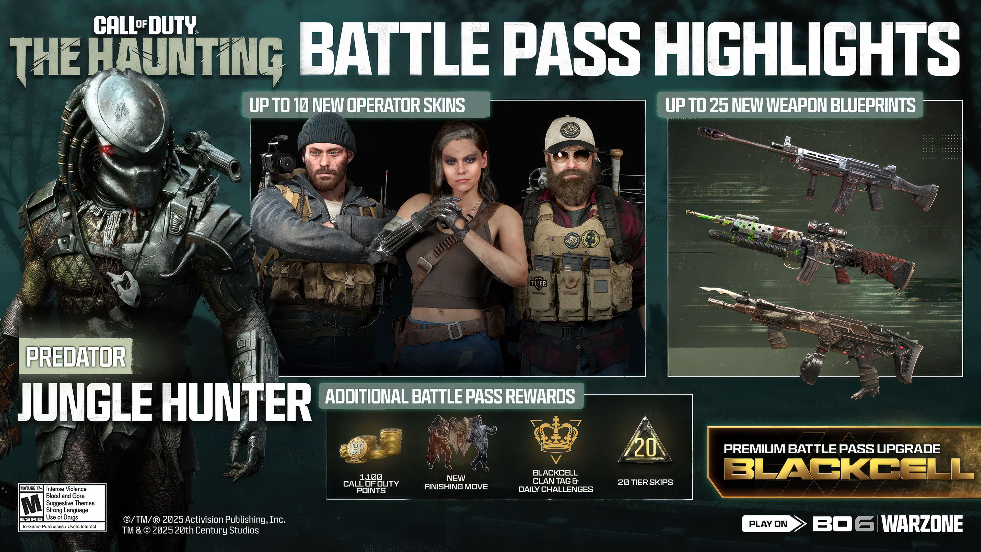 Боевой пропуск этого сезона возглавляет Predator и включает в себя жуткую коллекцию обликов Операторов, чертежей Оружия и других предметов, вдохновленных The Haunting и классическими фильмами ужасов. Вы можете получить Боевой пропуск за 1100 COD Points, или комплект Боевого пропуска за 2400 COD Points, который мгновенно открывает страницу, полную наград.