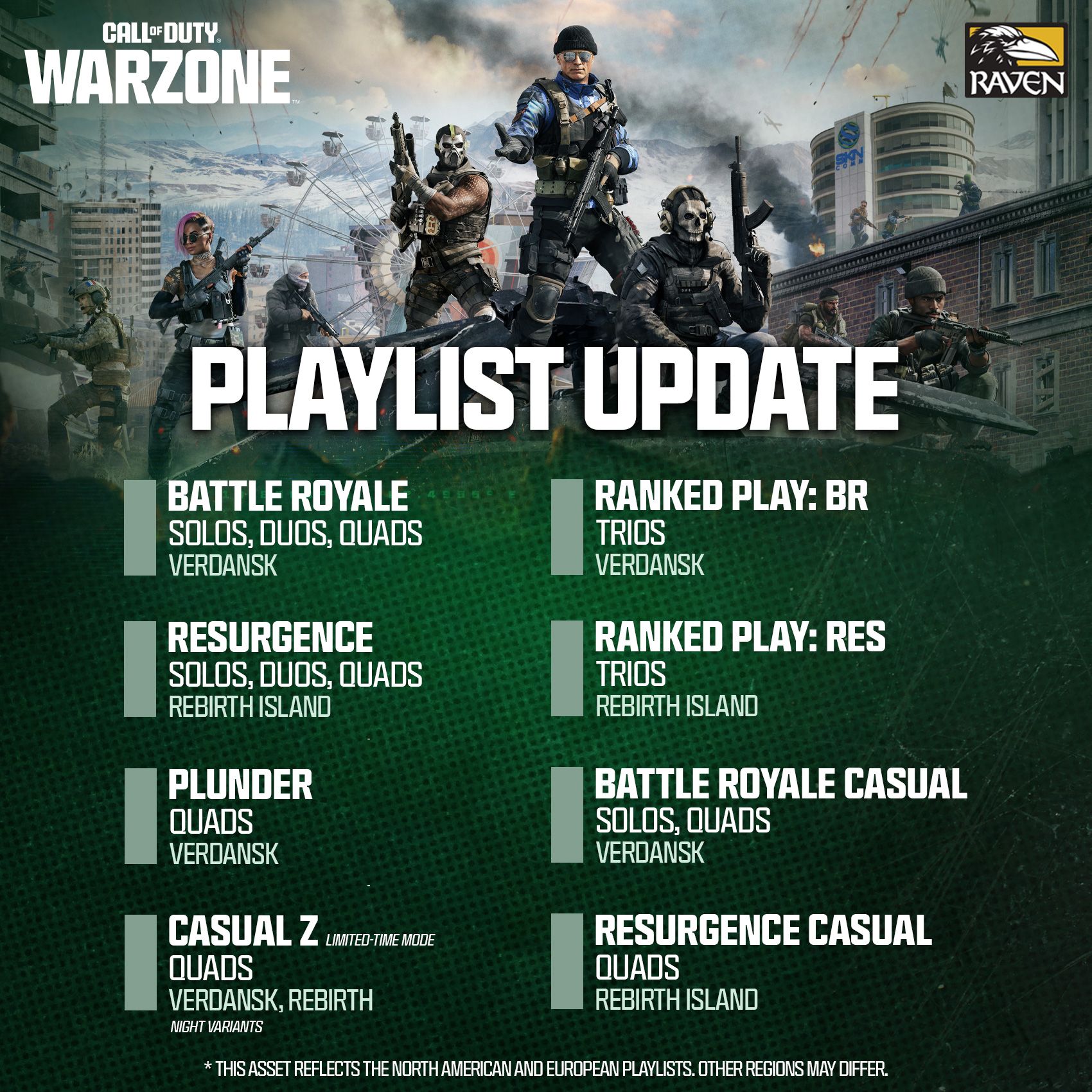 Во время Сезона 6 игроки *Warzone* смогут вновь посетить популярные ночные версии Верданска и Острова Возрождения на ограниченное время. Обновление представляет два новых режима с ограниченным временем действия – Battle Royale Casual Z и Resurgence Casual Z – где игроки будут сражаться как друг с другом, так и с волнами Зомби на Острове Возрождения и в Верданске. Кроме того, обновление в середине сезона добавит Zombie Royale, режим, позволяющий игрокам вернуться в игру в качестве Зомби с уникальными способностями.