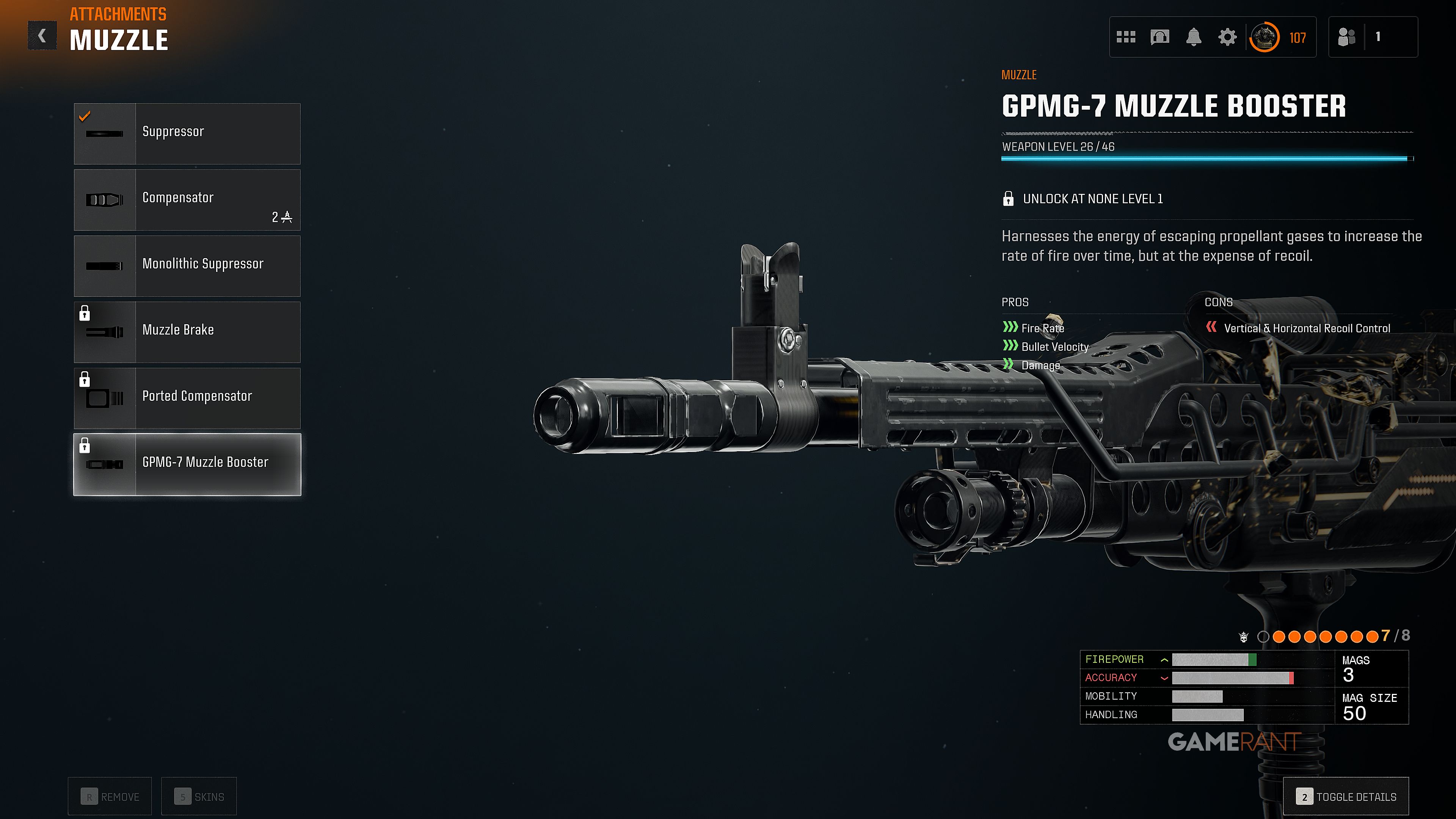 Устройство для ствола GPMG-7 LMG увеличивает скорострельность оружия, повышает скорость пули и увеличивает урон по мере использования. Однако, оно немного усложняет контроль над оружием, как по горизонтали, так и по вертикали.