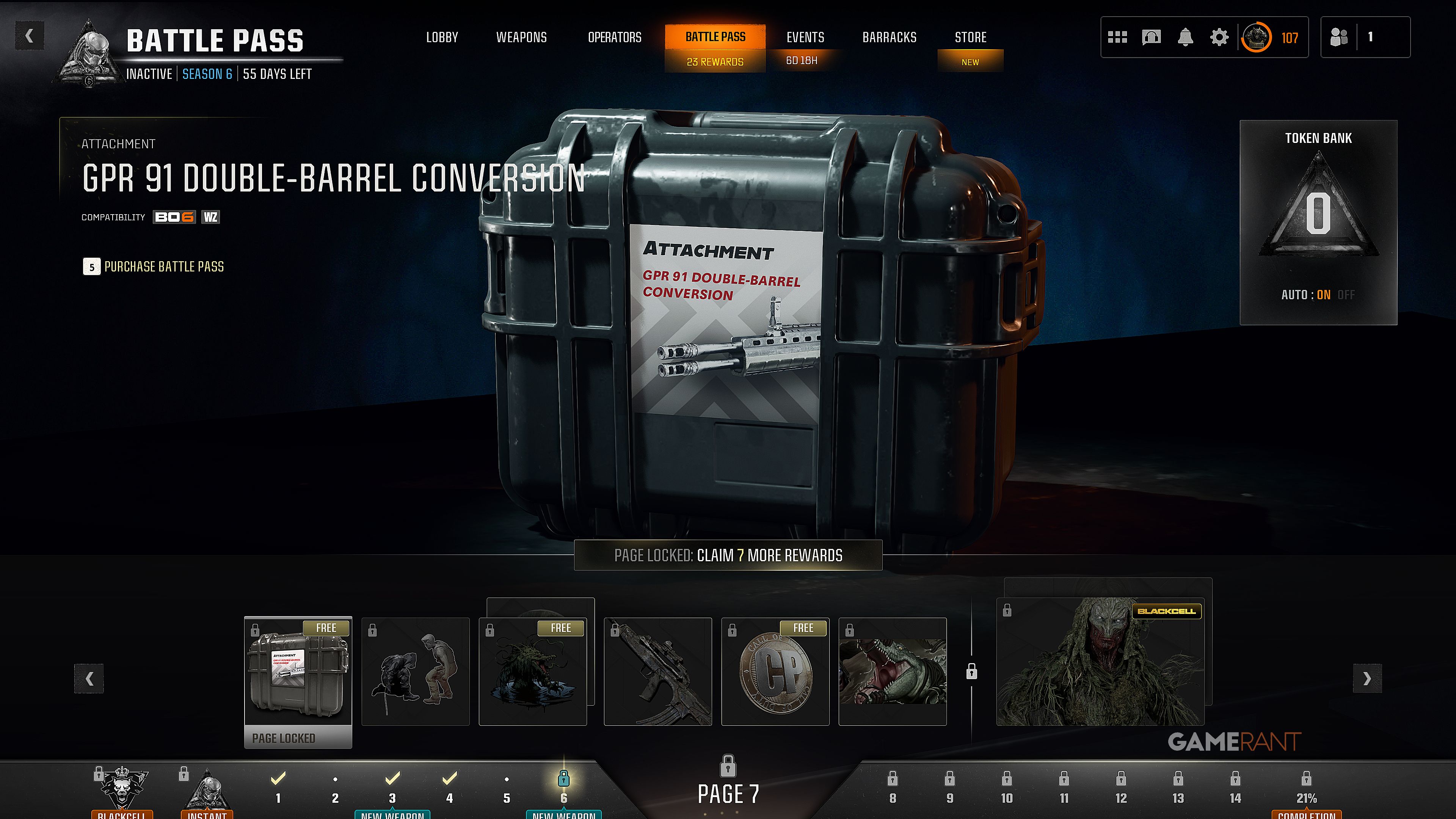 Конверсия GPR 91 с двойным стволом — это не новое оружие само по себе, а скорее насадка на ствол, которая значительно меняет функциональность GPR 91. Вы можете получить её в качестве бесплатной награды на 7-й странице Боевого пропуска Сезона 6, и в отличие от некоторых других разблокировок, вам не нужно проходить всю страницу, чтобы получить её.