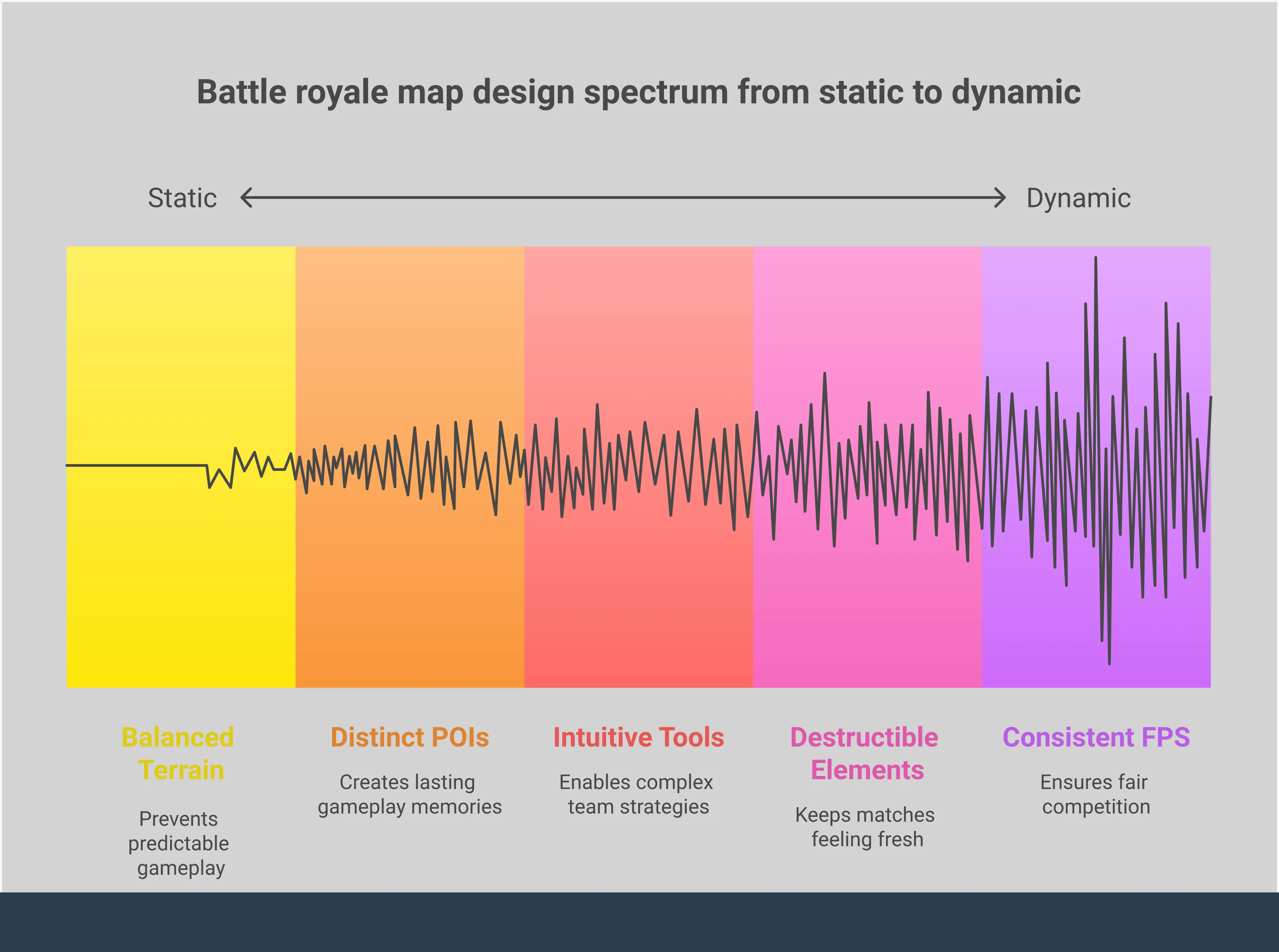 Хороший дизайн уровней даёт игрокам реальный выбор. Речь идёт о стратегическом размещении интересных областей, ценных предметов и целей, чтобы создать захватывающие риски и награды. Области с лучшим лутом должны привлекать игроков, приводя к ранним сражениям. Однако также должны быть безопасные, тихие пути для команд, которые хотят развиваться постепенно. События и миссии должны быть расположены таким образом, чтобы побуждать игроков перемещаться по карте и избегать простого укрытия. Это тщательное планирование сохраняет игру динамичной и увлекательной от самого начала до конца.