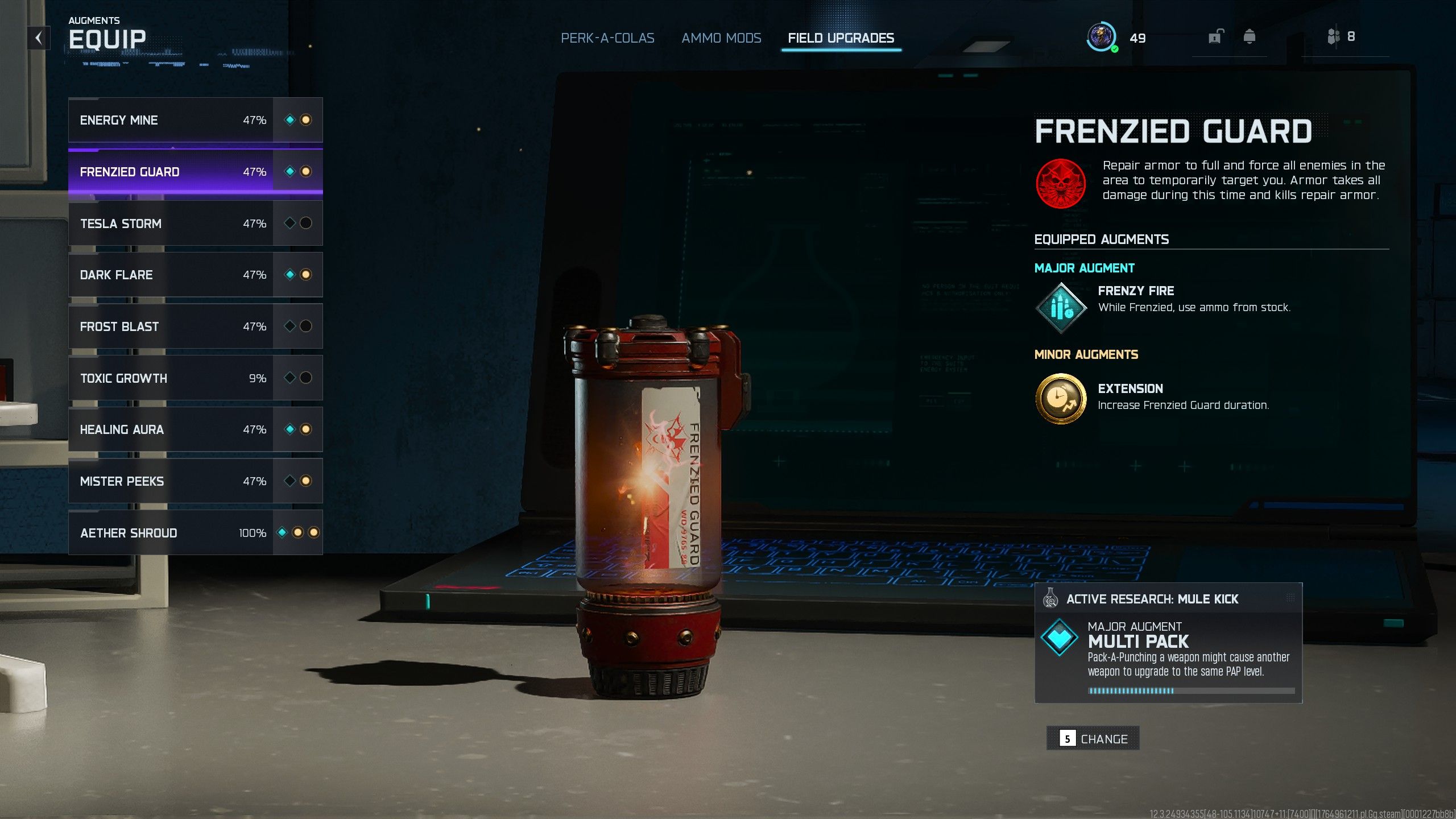 Окей, значит, для босса Astra Malorum я выбираю Frenzied Guard. Aether Shroud является хорошим вариантом, особенно если вы улучшили его аугментами Extra Charge и Extension – это потрясающе, потому что босс и зомби практически игнорируют вас, когда он активен. Но этот босс бьёт сильно с большим количеством урона по области, поэтому даже с Shroud вы всё равно будете получать урон. Именно поэтому я выбираю Frenzied Guard. Он позволяет моей броне поглощать большую часть урона, а с аугментом Frenzy Fire я могу просто продолжать стрелять и наносить тонны урона!