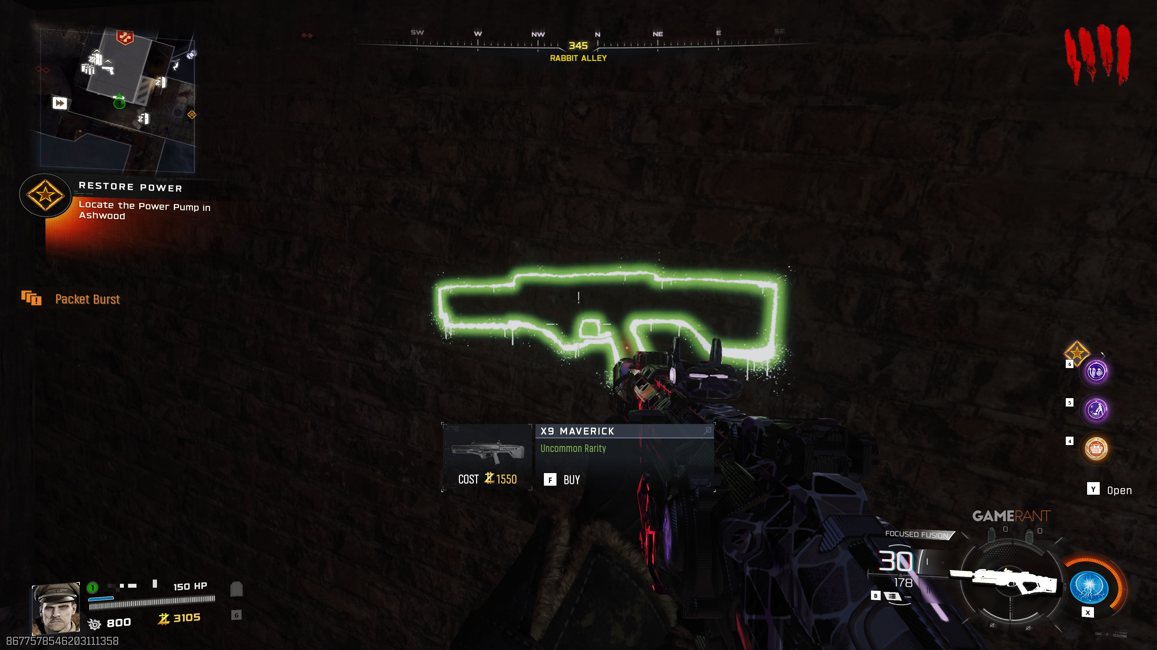Вы можете найти X9 Maverick в Ruby Alley, на стене сразу справа от The Ruby Rabbit. Чтобы туда добраться, вы можете либо пересечь Ashwood Bridge, либо воспользоваться зиплайном из Judgement Square.